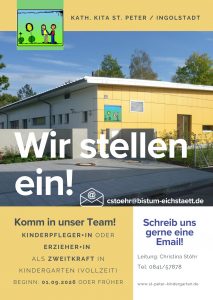 Einfach mal reinschnuppern? So funktionierts… Dein Praktikum in der Kita St. Peter Du hast Interesse uns mal über die Schulter zu sehen? Du benötigst für deine Ausbildung ein Praktikum? Melde dich gerne bei uns unter: Telefon: 0841/57878 Email: st-peter.in@kita.bistum-eichstaett.de Ansprechpartner: Christina Stöhr (Kita-Leitung) Wir......